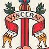 Description: Vintage card back with a crest reading "Vincerai" or you will win.